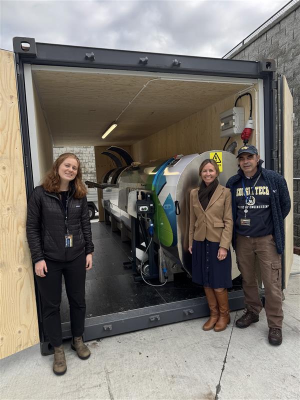 Pictured left to right: Members of the Office of Sustainability Abby Bower, Jennifer Chirico, and Steve Place welcome the new large-scale compost vessel to campus.