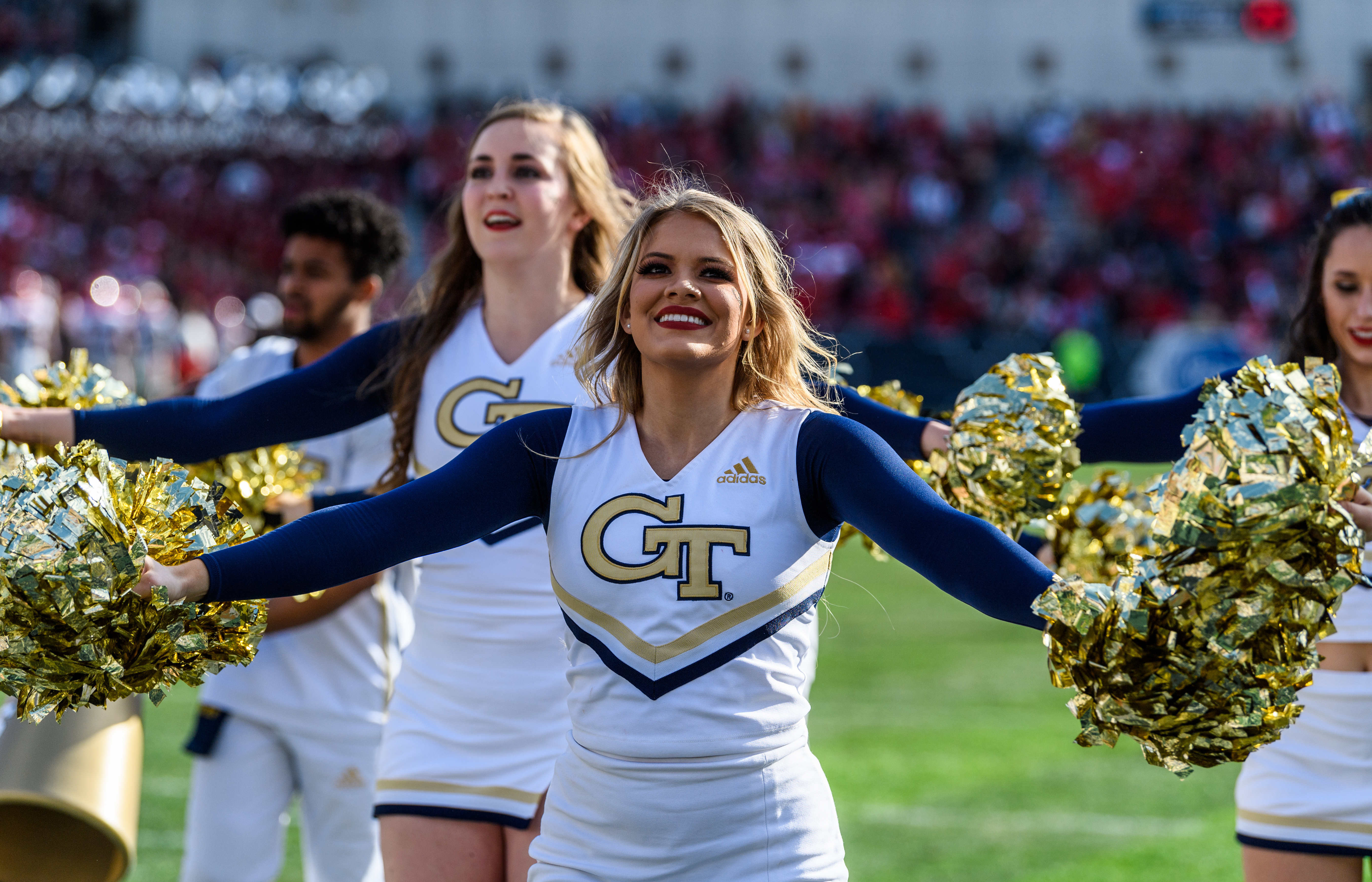 McClain Broussard cheering during a 2019 football game in Bobby Dodd Stadium at Hyundai Field on the Georgia Tech campus. Photo courtesy: Danny Karnik/Georgia Tech Athletics